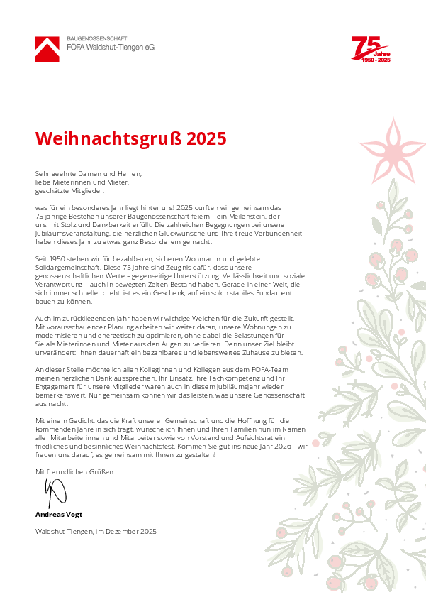 Die Geschäftsstelle der Baugenossenschaft bleibt, wie in den Vorjahren, zwischen den Jahren (20.12.25 bis 06.01.2026) geschlossen.